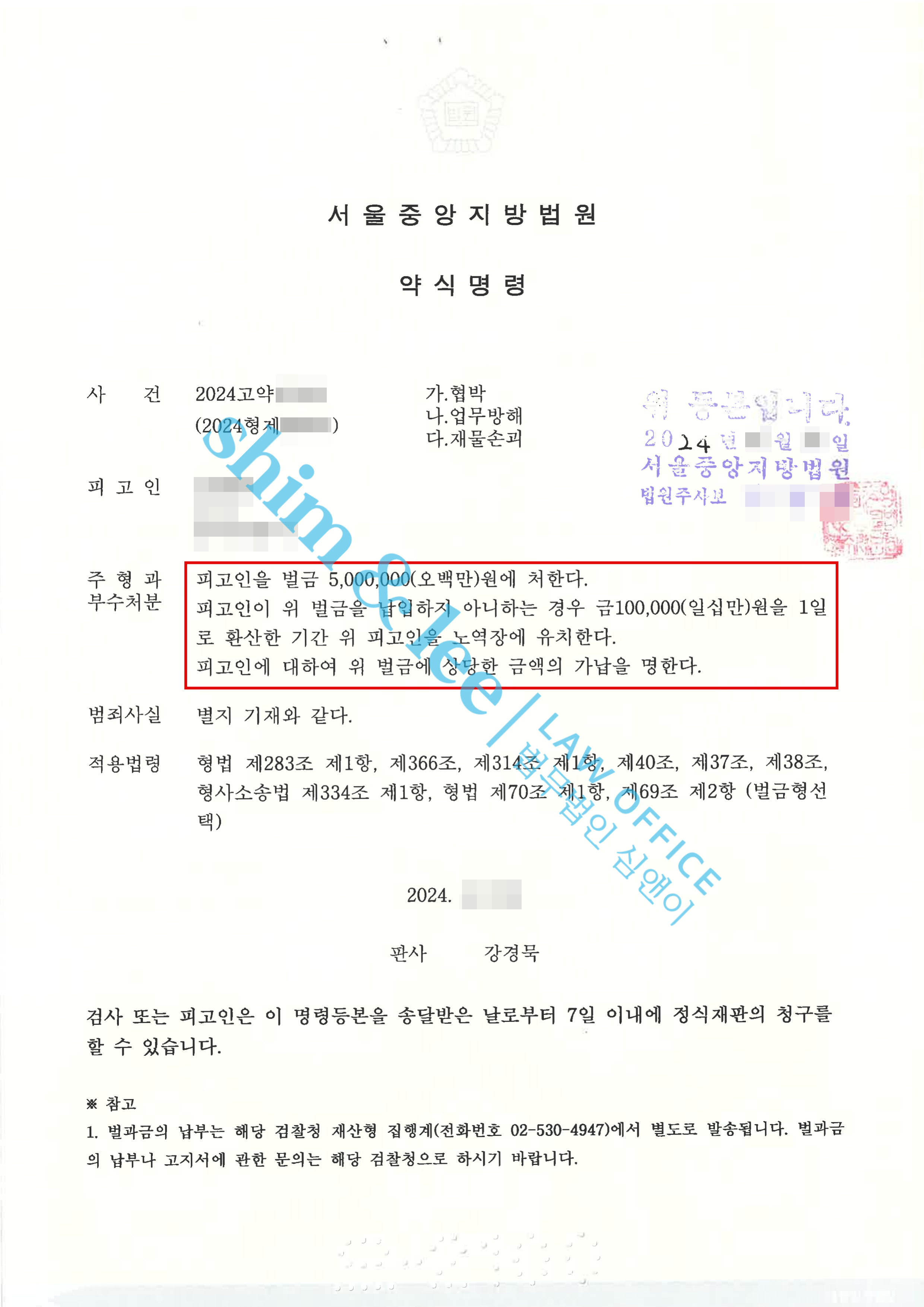 - 마침내 가해자는 의뢰인을 협박하고 의뢰인의 재물을 손괴하여 업무방해까지 저지른 혐의가 모두 인정되어 벌금 500만 원의 구약식 처분을 받았습니다.