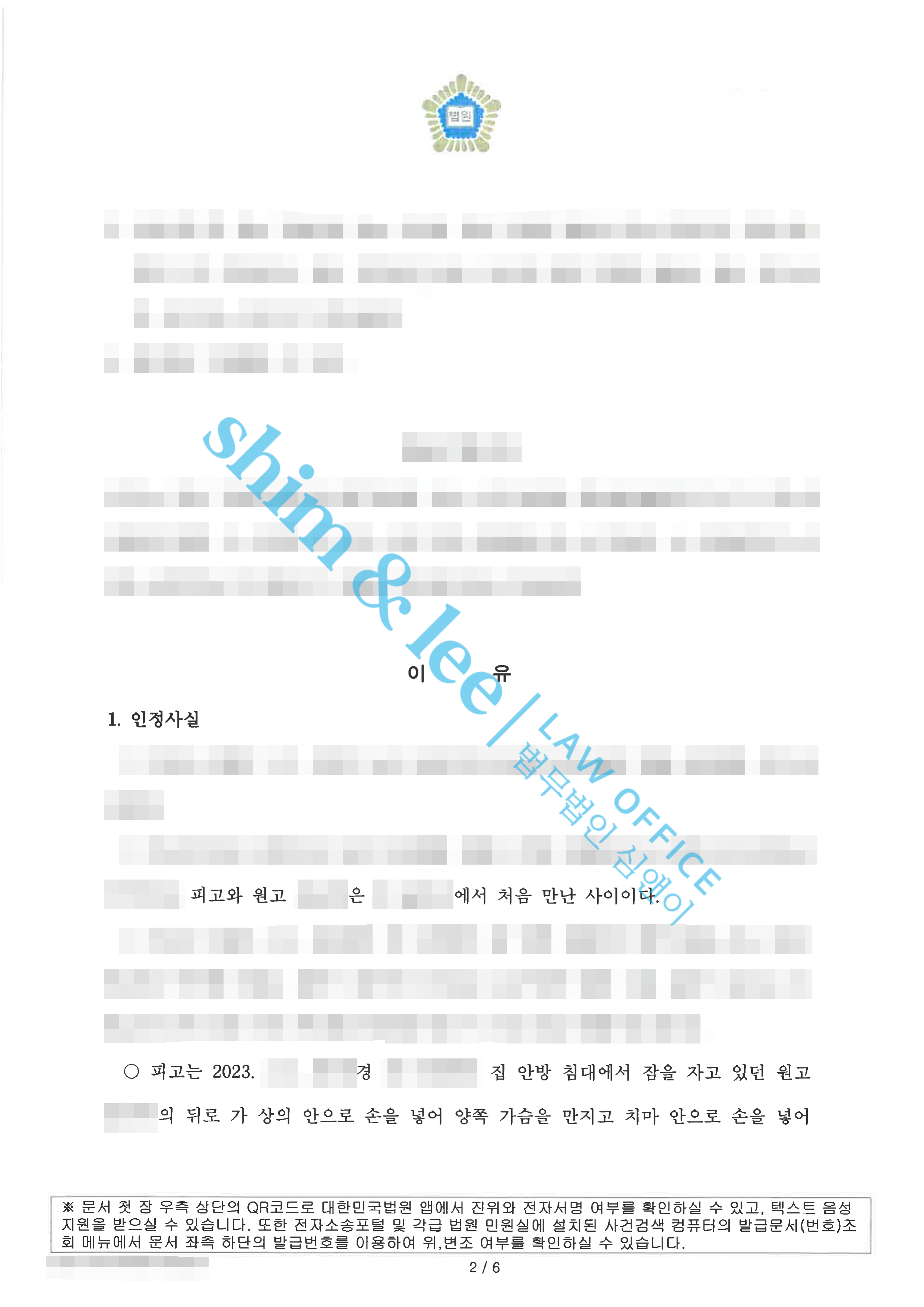 - 가해자는 술에 취해 잠을 자고 있던 의뢰인의 방에 몰래 들어가 가슴을 만지고, 성기를 삽입하였습니다. 음부 통증에 잠에서 깬 의뢰인은 가해자를 보고 즉시 경찰에 신고를 하였습니다.