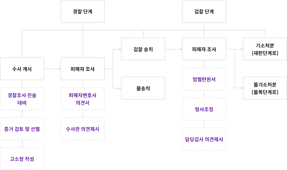 - 모든 재판일에 출석하여 진행상황을 체크하고 변호사 의견서와 탄원서 제출로 가해자의 주장에 대응하며, 피해자 증인신문 대비 및 출석 동행을 통해 최종적인 가해자의 처벌까지 책임집니다.