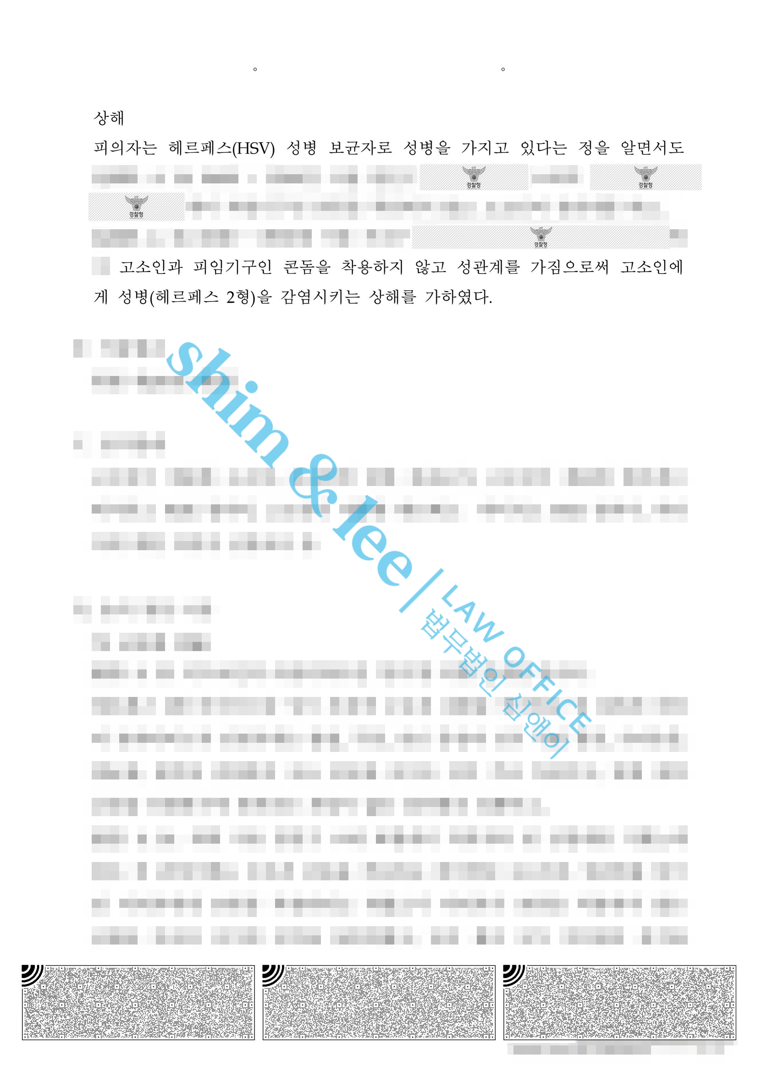 마지막으로 설령 가해자가 본인의 성병 보균 사실을 인지하지 못했더라도, 성기에 약 2cm 크기의 발진이 있다는 점은 이미 인지하고 있었던 이상, 성관계 상대에게 감염 위험을 알리고 예방 조치를 취할 주의의무가 있으므로 가해자에게 상해의 고의가 인정되지 않더라도, 예비적으로 과실치상 혐의에 대하여 수사해줄 것을 함께 요청하였습니다. -