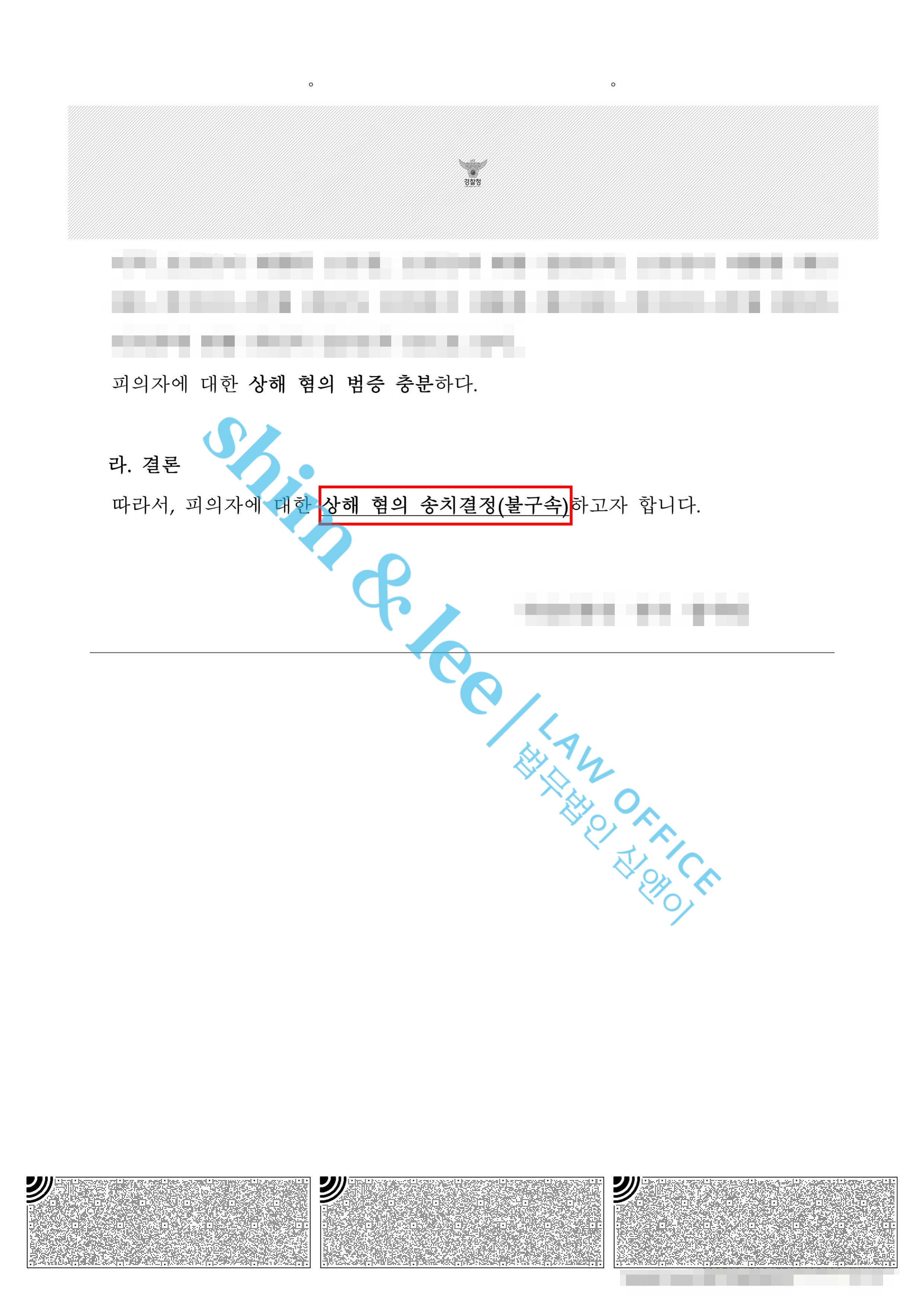 - 결국 심앤이의 주장이 모두 받아들여져, 가해자는 대표 변호사님이 특정하신 ‘상해’ 혐의로 송치되었습니다.