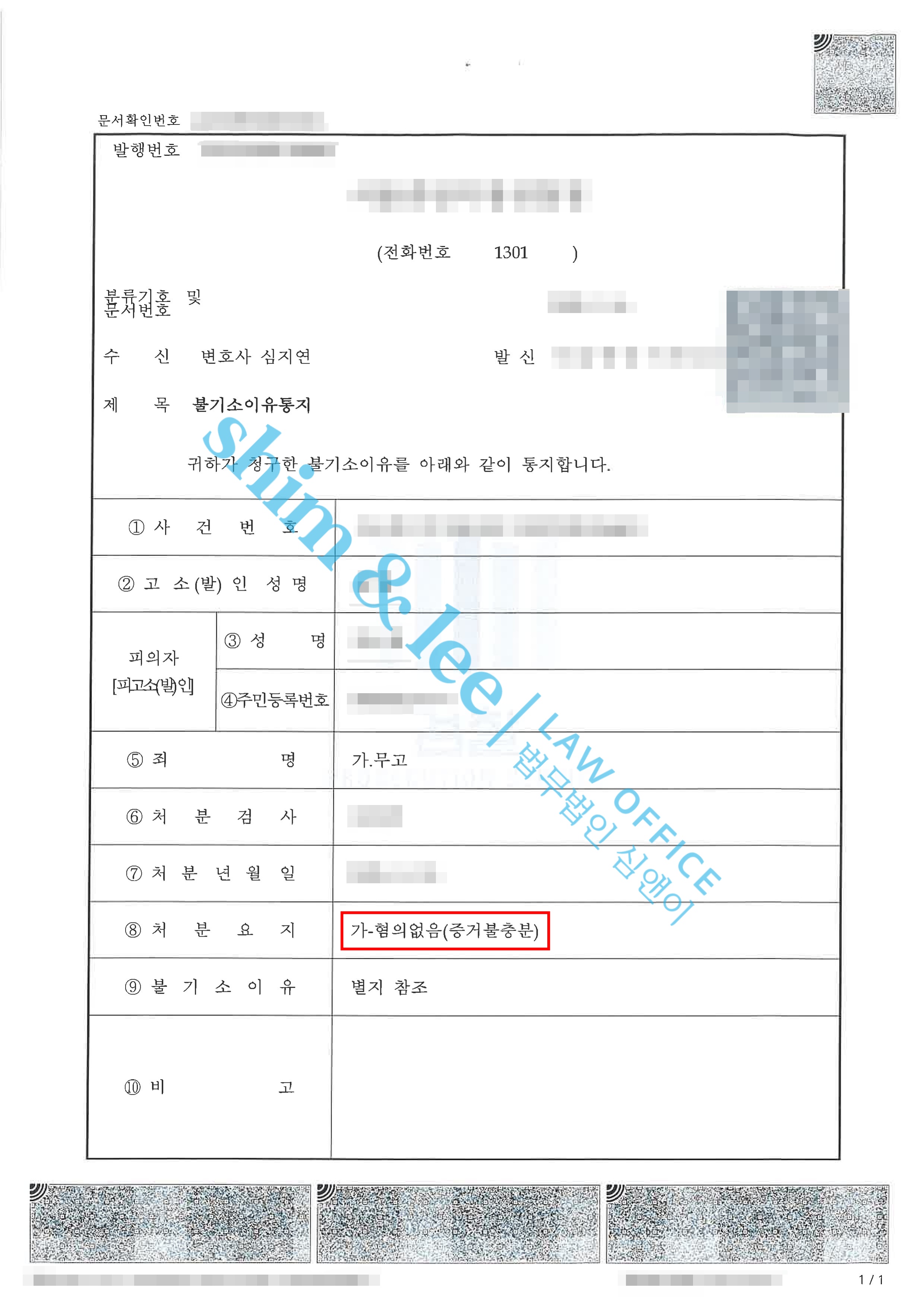 - 결국 심앤이는 의뢰인이 허위 사실을 꾸며내어 의도적으로 가해자를 처벌하고자 신고한 것이 아님을 설득력 있게 입증하여, 무고죄 혐의에 대하여 최종 불기소 처분을 받아냈습니다.