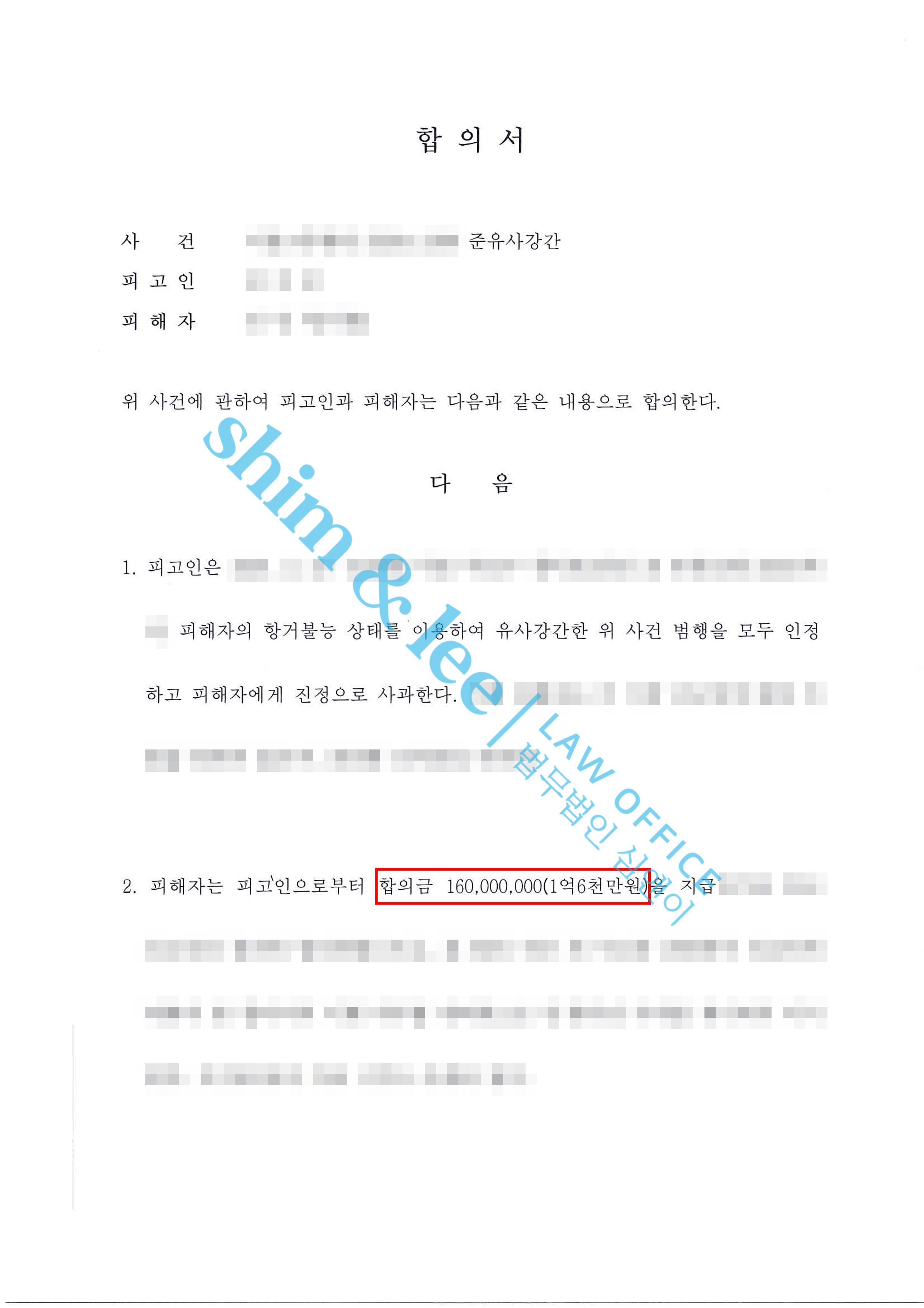 - 또한 합의를 제안하고 싶다면, 피해자가 입은 피해에 상응하는 확실한 피해 보상금을 제안해야 할 것이고 최소 1억 원이 아니라면 합의는 어렵다는 입장을 단호하게 전달했습니다. -