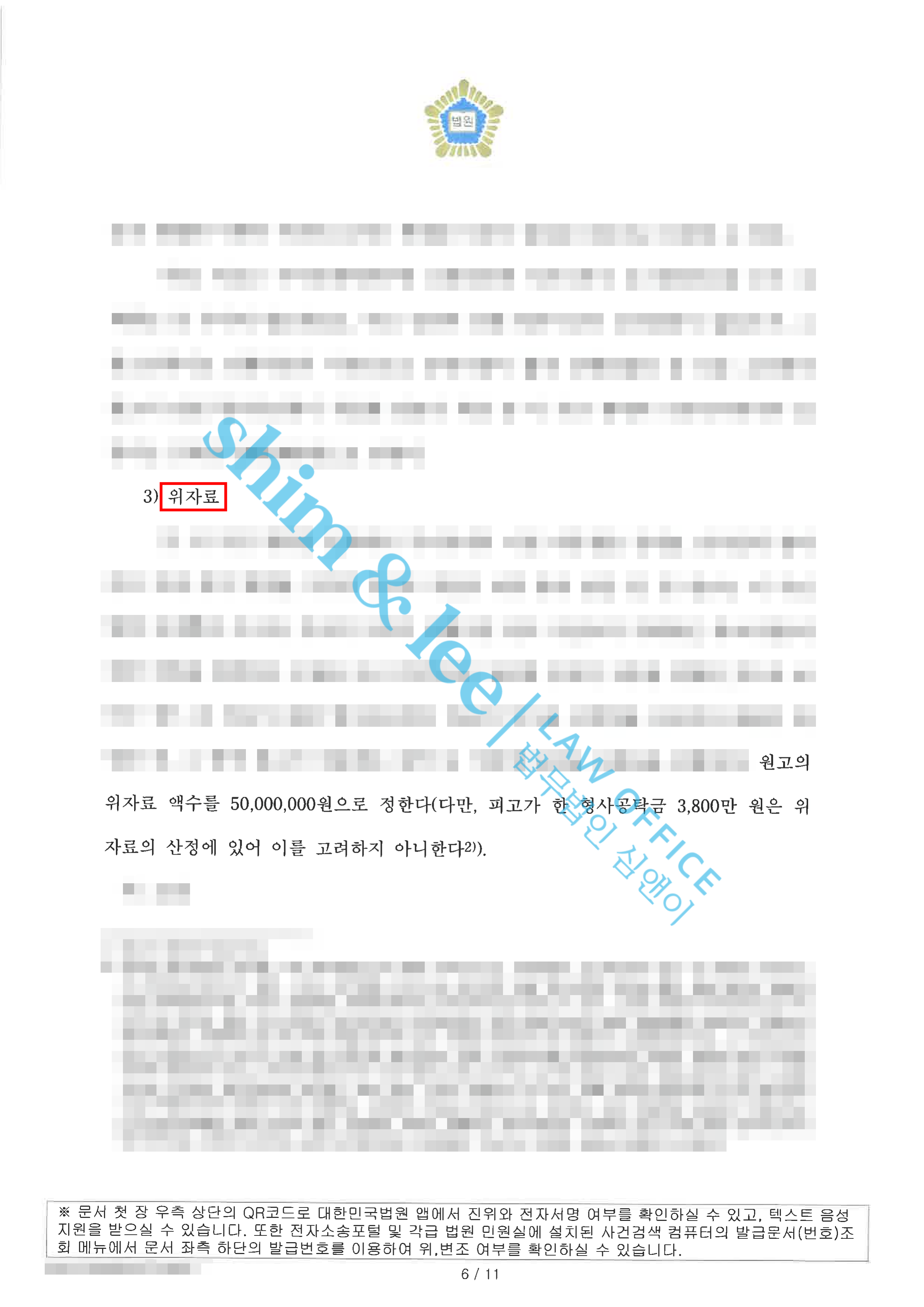 - 최종적으로 민사 재판부는 피고에게 손해배상 책임이 있음을 인정하고, 원고가 청구한 ① 실제로 지출한 적극적 손해인 치료비, ② 형사소송에서 사용한 변호사 선임 비용, ③ 정신적 피해에 대한 위자료를 모두 인정하였습니다. 특히 피고가 주장하던 형사공탁금 3,800만 원 역시 피해자가 그대로 수령할 수 있도록 하면서, 추가적으로 5,000만 원 이상의 위자료를 인용하여 형사 공탁금까지 포함해 실질적으로 총 92,136,522원의 위자료를 인정한 것입니다.