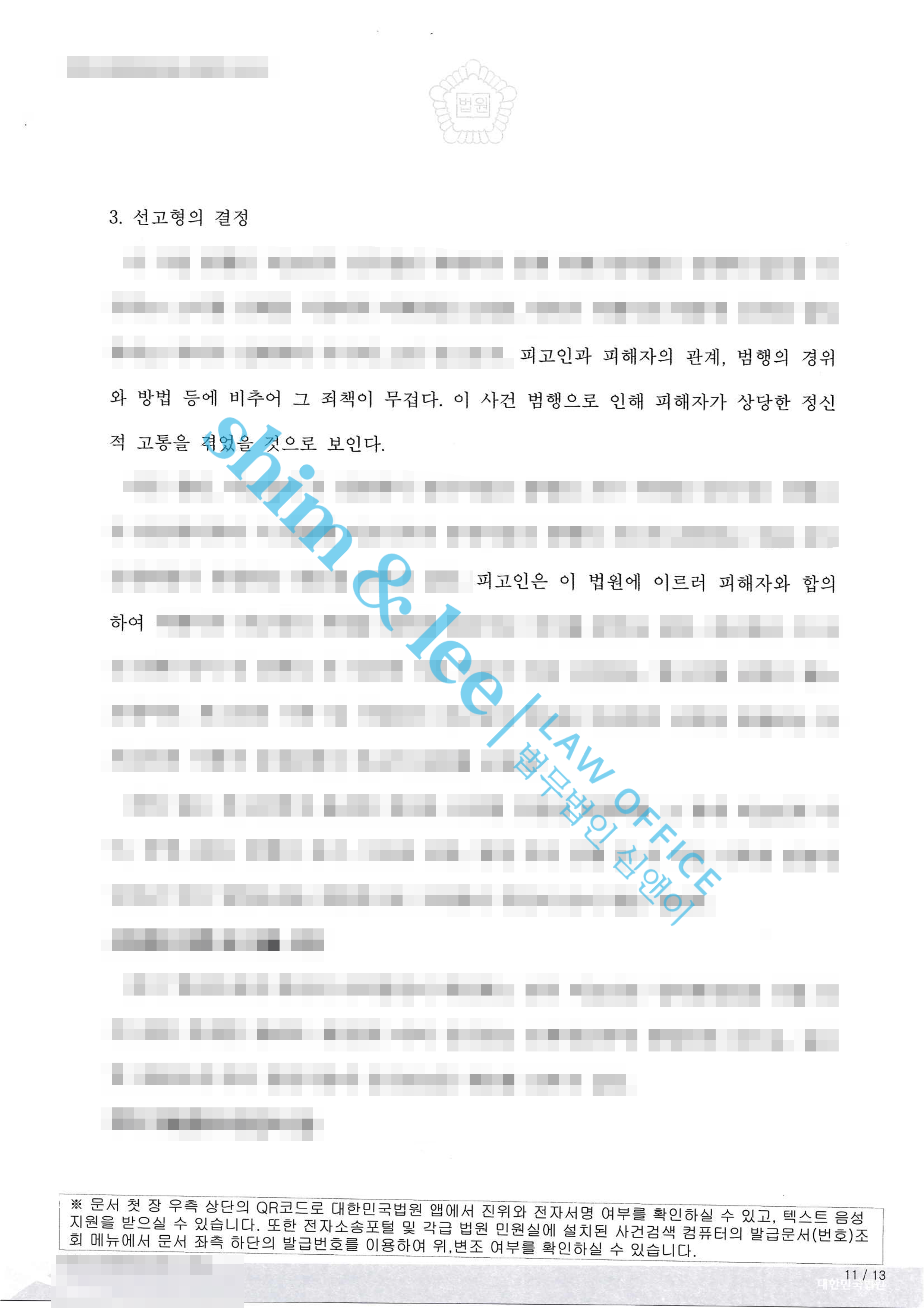 - 그리고 의견서를 통해 의뢰인이 겪은 정신적 피해와 일상생활의 어려움, 가해자가 반성 없이 일상생활을 이어온 정황 등을 적극적으로 주장한 결과, 합의를 했음에도 2심 재판부는 “가해자의 범행 경위와 방법에 비추어 죄책이 무겁고, 피해자는 이 사건으로 상당한 정신적 고통을 겪고 있다”는 점을 들어 가해자에게 징역 1년, 집행유예 2년과 성폭력 치료강의 40시간을 선고했습니다.