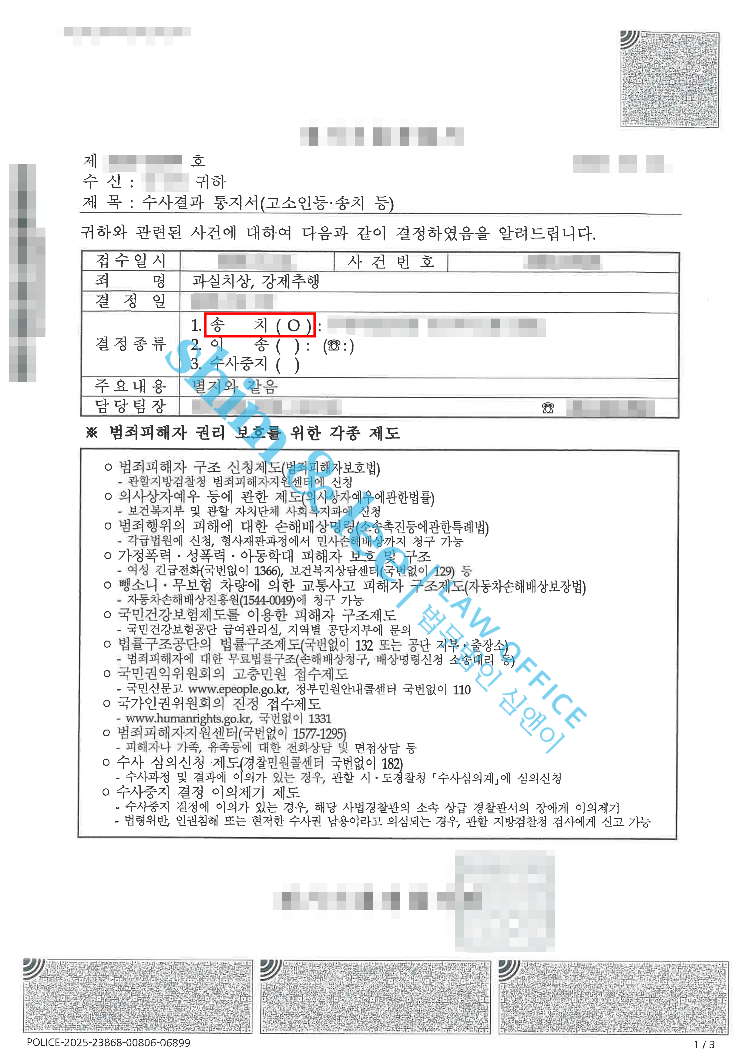 - 심앤이가 담당 수사관에게 CCTV 확보를 요청하고 목격자 진술과 변호사 의견서를 통해 사실관계를 구체적으로 입증한 결과, 수사기관은 가해자에게 강제추행, 과실치상 혐의가 인정된다고 판단하여 송치 결정을 내렸습니다.