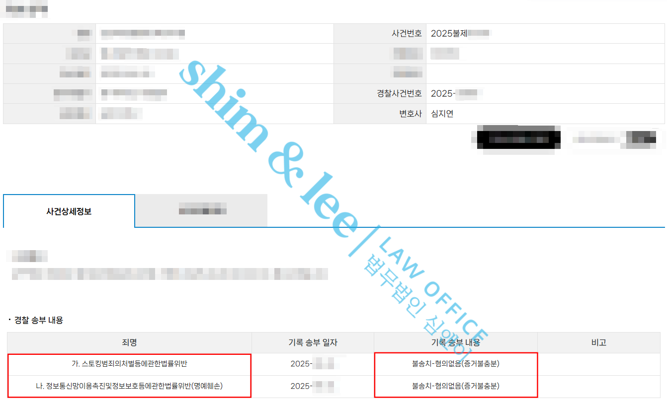 - 심앤이는 곧장 수사기관에 선임계를 제출한 후 정보공개청구를 통해 고소장을 확보하였고, 담당 수사관과 소통한 결과 구체적인 혐의는 ①의뢰인이 일방적으로 이별을 고하고 잠적한 상대방에게 연락을 하기 위해 발신자번호표시제한으로 12번 연락한 행위는 스토킹 혐의로, ②의뢰인이 상대방의 동생에게 성병감염 사실을 문자로 알린 행위는 명예훼손 혐의로 고소당한 사실을 파악하였습니다.