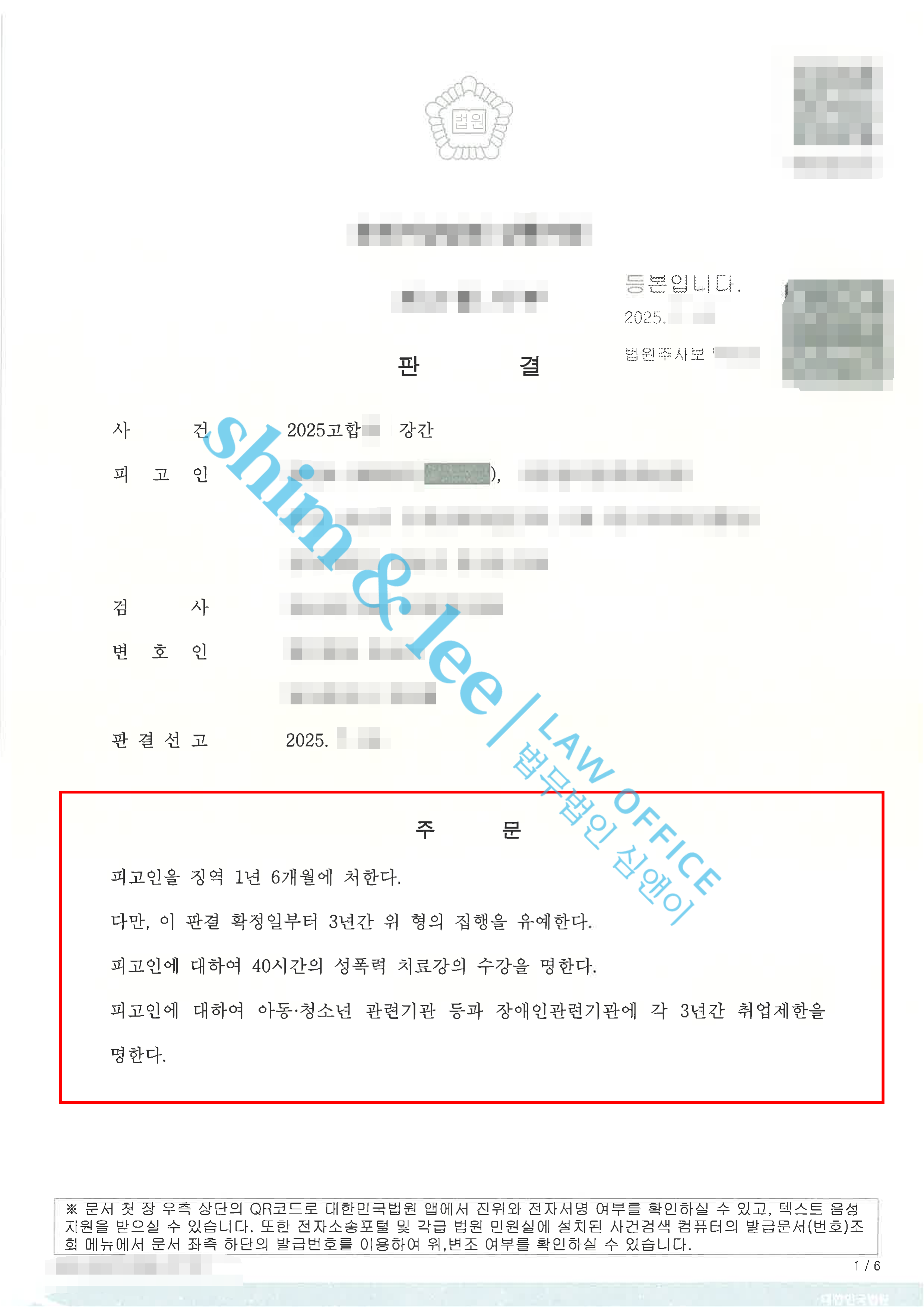 -큰 충격을 받은 의뢰인은 즉시 고소를 진행했고, 가해자는 재판 과정에서 4천만 원을 공탁하며 선처를 구했습니다. 그 결과 1심 법원은 징역 1년 6월, 집행유예 3년, 성폭력 치료강의 40시간, 취업제한 3년을 선고했습니다.