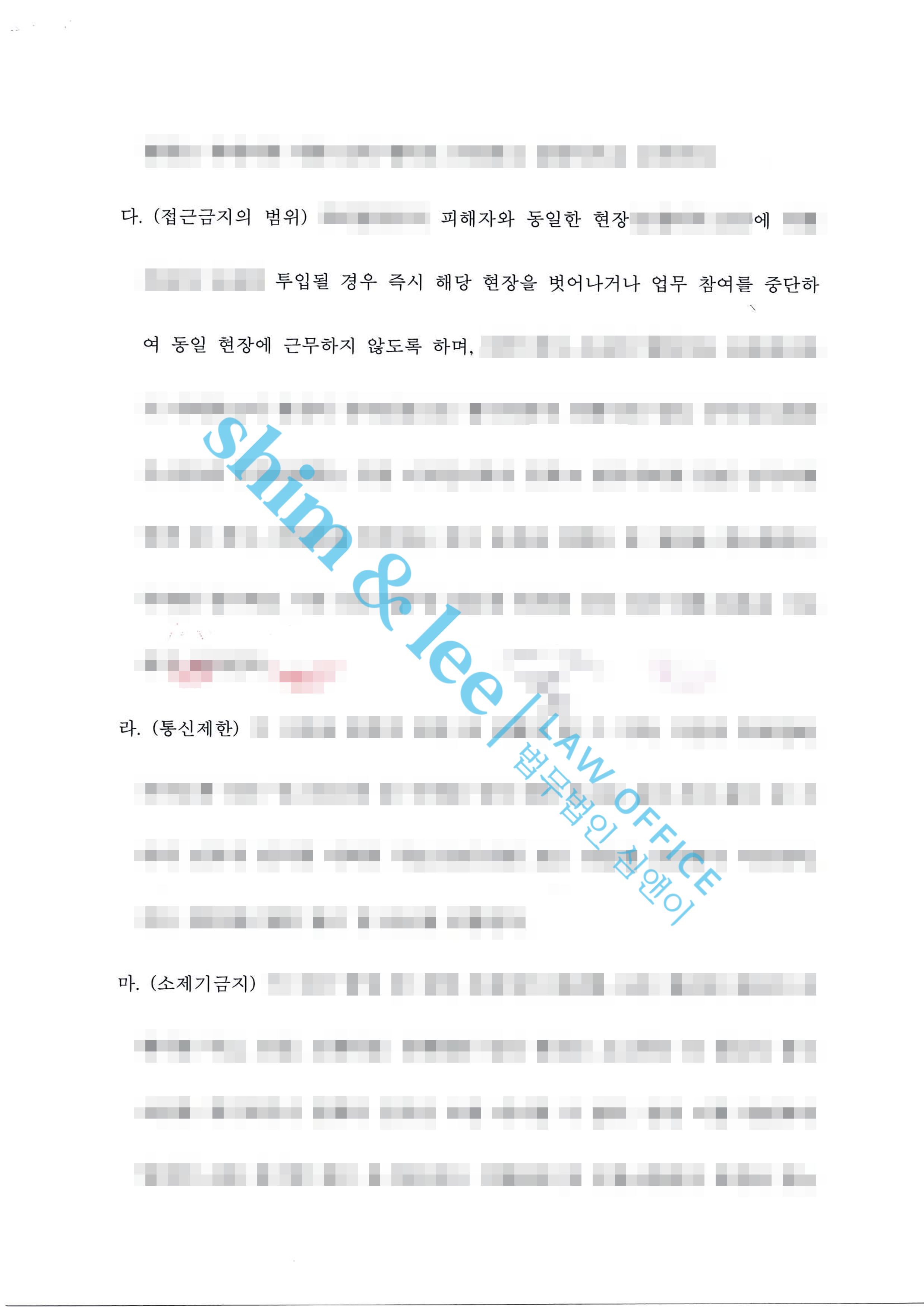 - 합의 과정에서 심앤이는 업계 특성상 가해자가 향후 의뢰인과 같은 현장에 배치될 위험을 고려해, 같은 현장 배치 시 즉시 업무를 중단하도록 하는 내용을 ‘접근금지의 범위’에 포함해 합의서를 구체적으로 작성했습니다. 이 밖에도 비밀유지, 접근·보복금지, 통신제한, 소제기금지, 위약벌 등 안전을 보장하기 위한 조항들을 꼼꼼히 반영하여 의뢰인이 안심하고 일상으로 돌아갈 수 있도록 합의를 이끌었습니다.