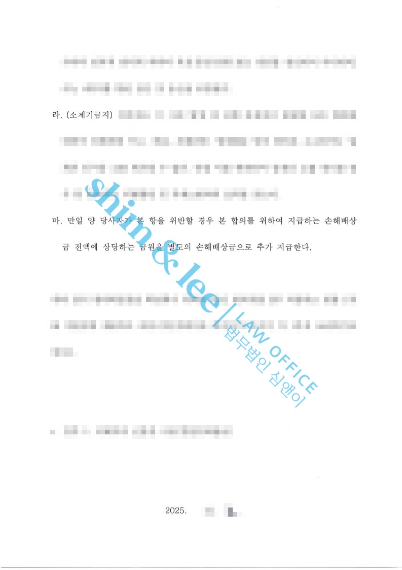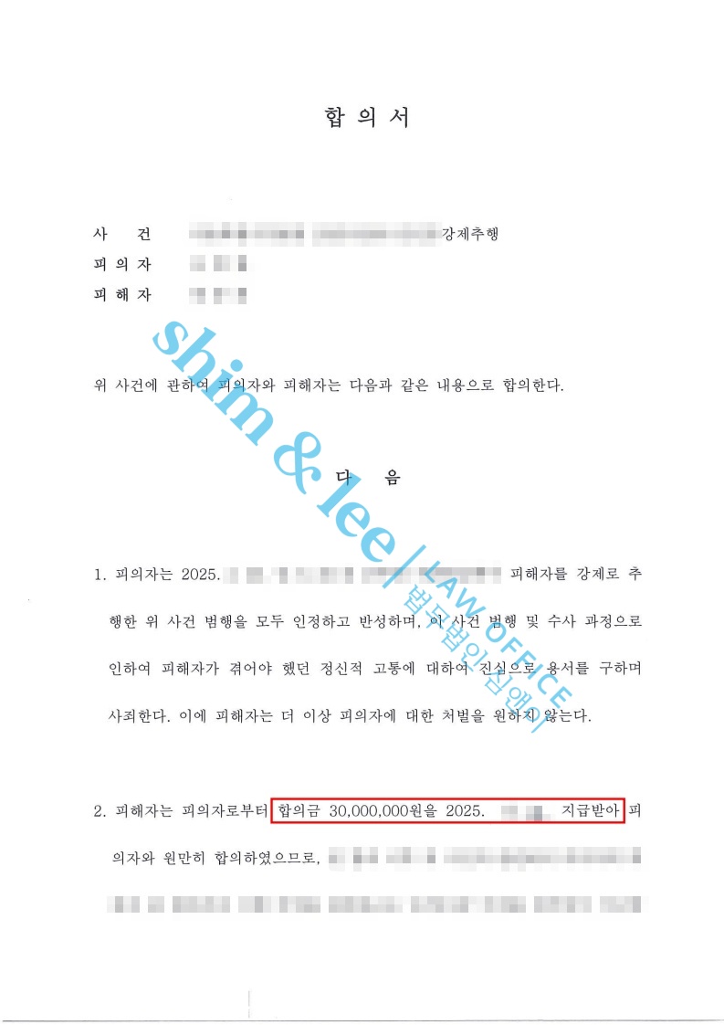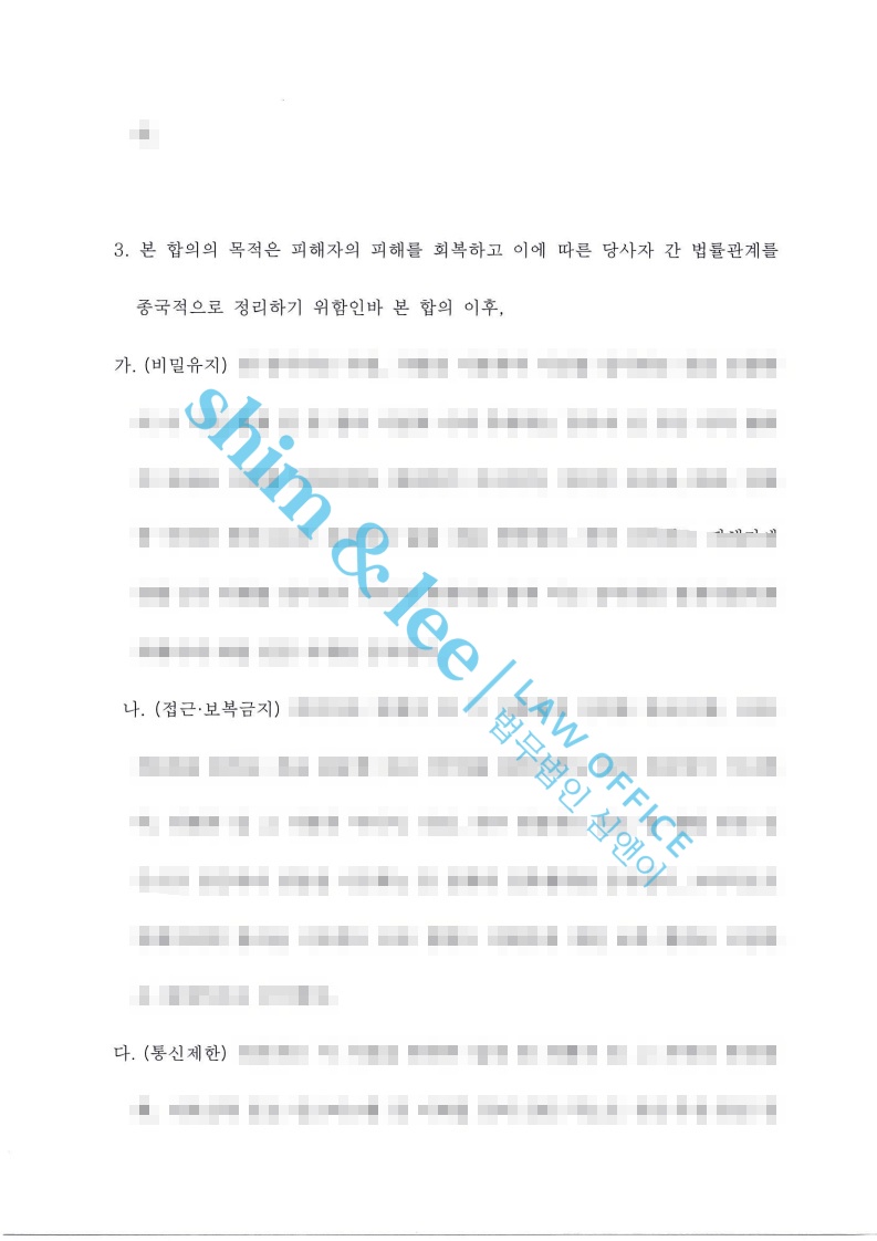합의서에는 비밀유지, 접근 보복금지, 통신제한, 소제기금지 등의 조항을 포함시켜 합의 이후에도 피해자가 2차 피해 없이 충분히 보호받을 수 있도록 했습니다.