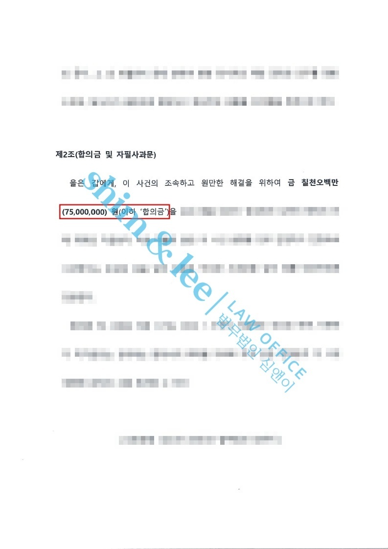 - 가해자는 결국 본인의 모든 혐의를 인정하고, 사과문을 전달해 진심으로 반성하는 태도를 보였고, 최종적으로 자필 사과문과 함께 처음 가해자가 제안했던 금액의 두 배가 넘는 7,500만 원으로 합의가 성사되었습니다.