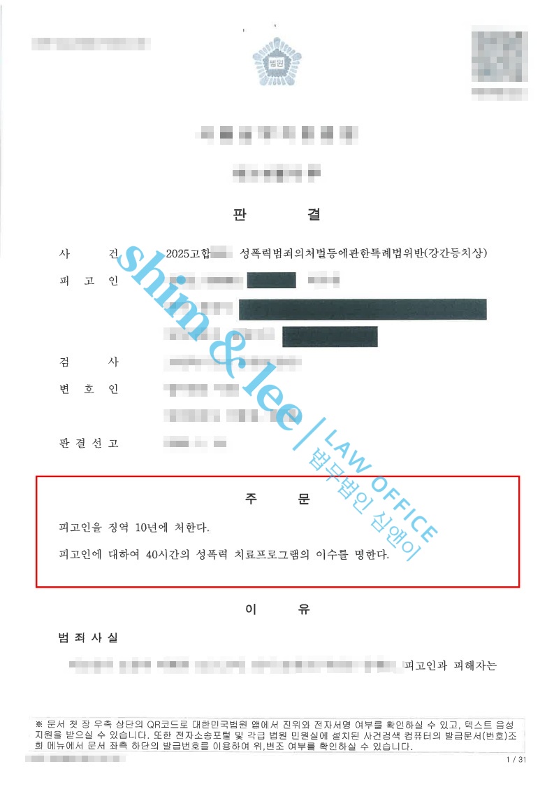 - 그 결과 가해자는 강간등치상 혐의로 징역 10년과 성폭력 치료강의 40시간이 선고받았습니다. 이는 검찰의 구형과 동일한 형량으로, 심앤이가 주장한 쟁점들이 재판부에 잘 전달되었음을 보여주는 결과였습니다.