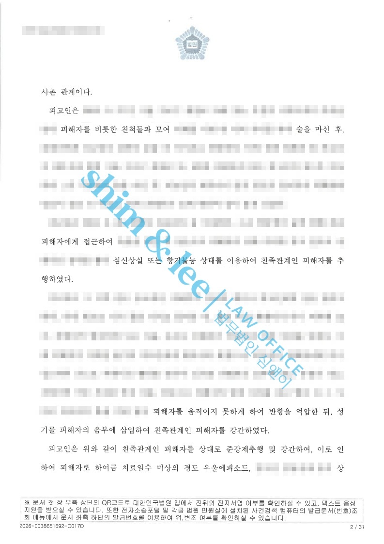 -너무 놀란 의뢰인은 술 기운이 많이 올라와 이 상황이 꿈인지 현실인지 분간하기 어려웠고 소리를 지르면 온 가족에게 발견되어 수치스러운 상황이 생길까봐 저항만 할 수밖에 없었습니다. 그러나 가해자의 범행은 계속 이어졌고, 결국 피해자의 두 손을 결박한 뒤 간음에까지 이르렀습니다.