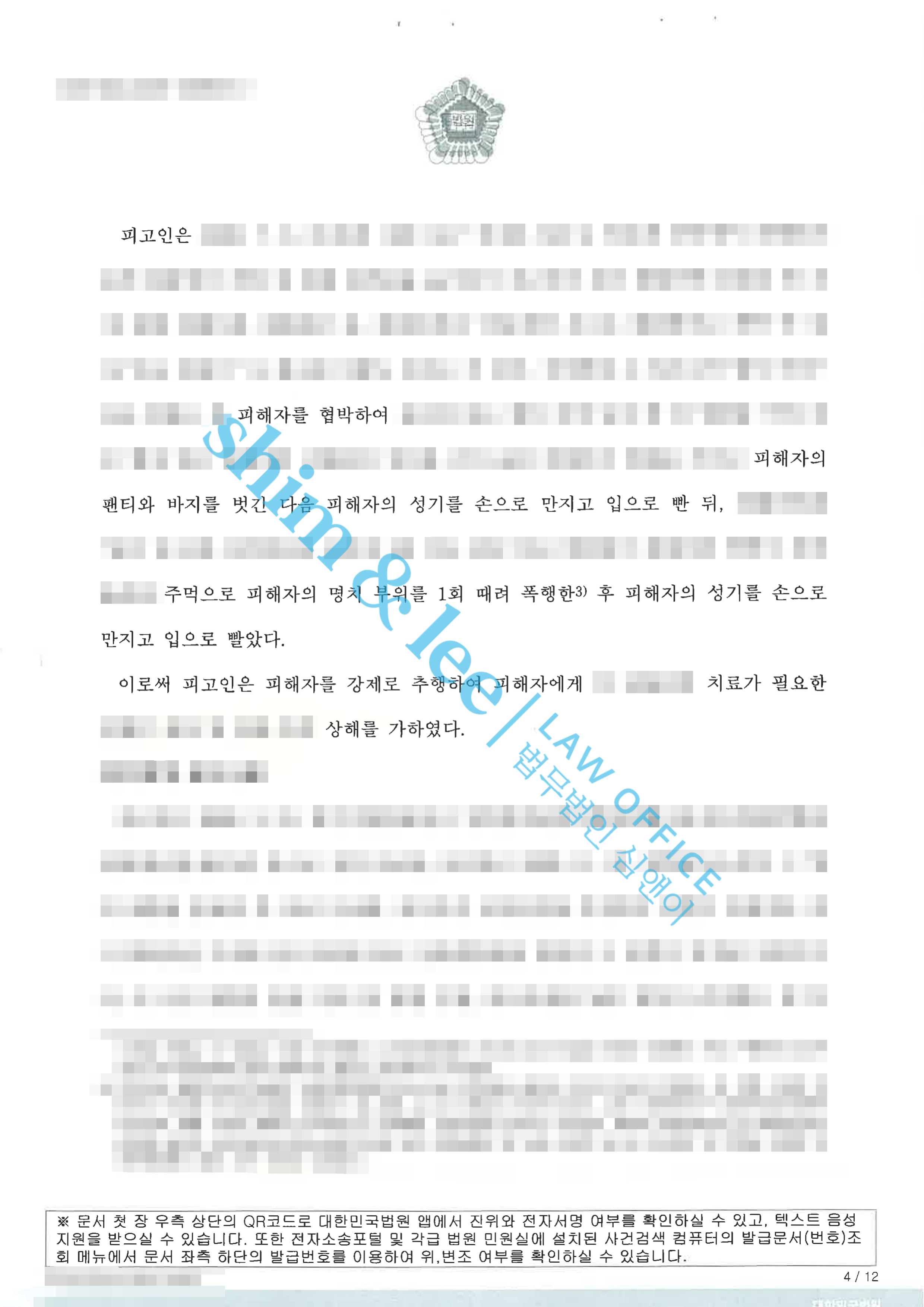 - 극심한 공포로 몸을 제대로 가누지 못하던 의뢰인이 팔굽혀펴기를 제대로 하지 못하자, 가해자는 갑자기 의뢰인의 얼굴을 가리고 옷과 속옷을 벗긴 뒤 자신이 성기를 빠는 것을 10분간 버티라며 의뢰인의 성기를 손으로 만지고 입으로 빨기 시작했습니다. 의뢰인이 소리를 지르며 저항하자, 가해자는 의뢰인의 명치를 주먹으로 강하게 때리며 범행을 이어갔습니다.