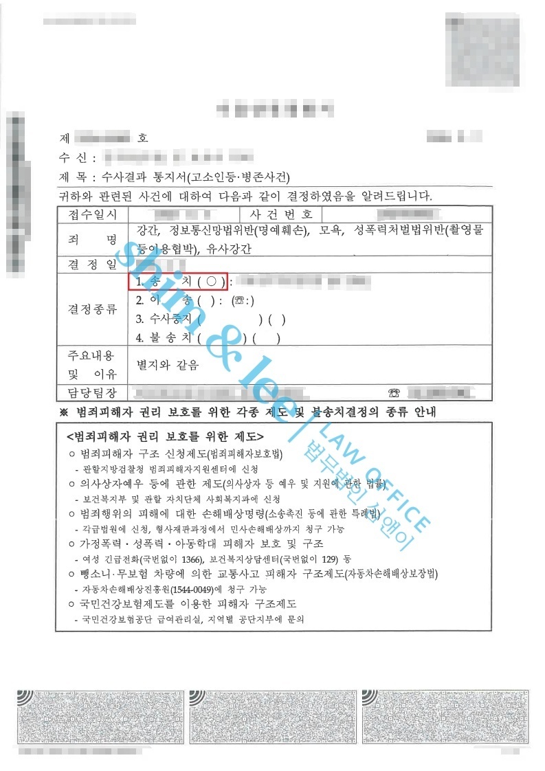 명예훼손, 모욕, 촬영물이용협박, 유사강간, 강간 혐의를 모두 포함해 고소보충서를 제출했고, 각 범죄사실이 수사 과정에서 빠짐없이 다뤄질 수 있도록 수사기관에 총 3차례 의견서를 제출했습니다.