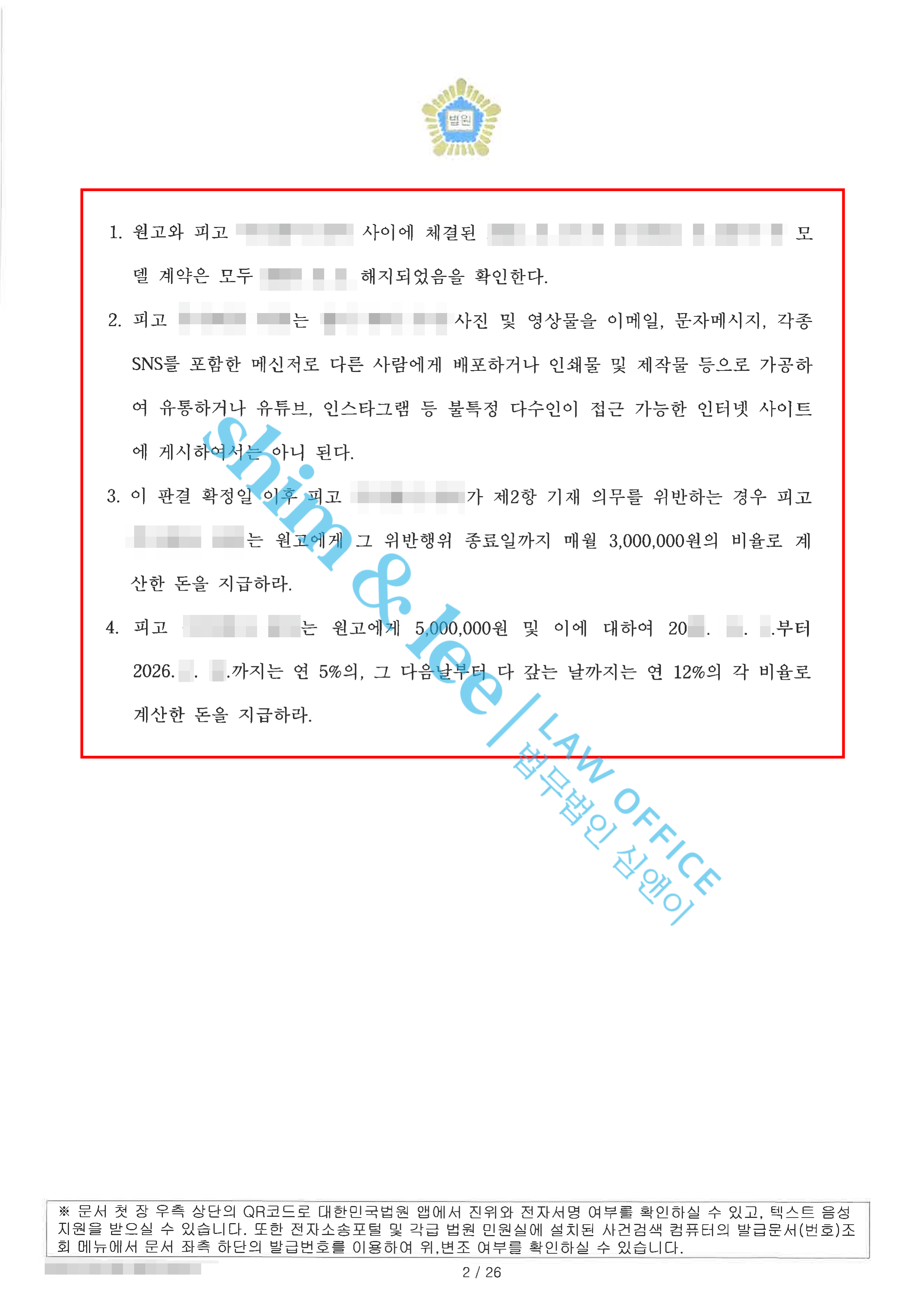 - 심앤이는 피고가 촬영물을 더 이상 게시하거나 배포하지 못하도록 금지를 요청하고, 이를 위반할 경우 매달 일정 금액을 지급하게 해 실제로 지키도록 만드는 조치까지 함께 신청해 원고의 추가적인 피해를 완전히 차단하는 방향으로 소송을 진행했습니다.