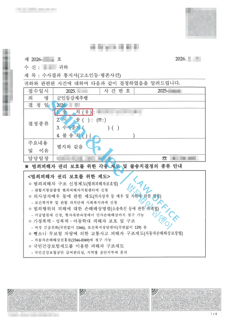 -결국 가해자가 피해자의 의사에 반해 추행을 저지른 것이 인정되어, 가해자는 군인등강제추행 혐의로 송치되었습니다.