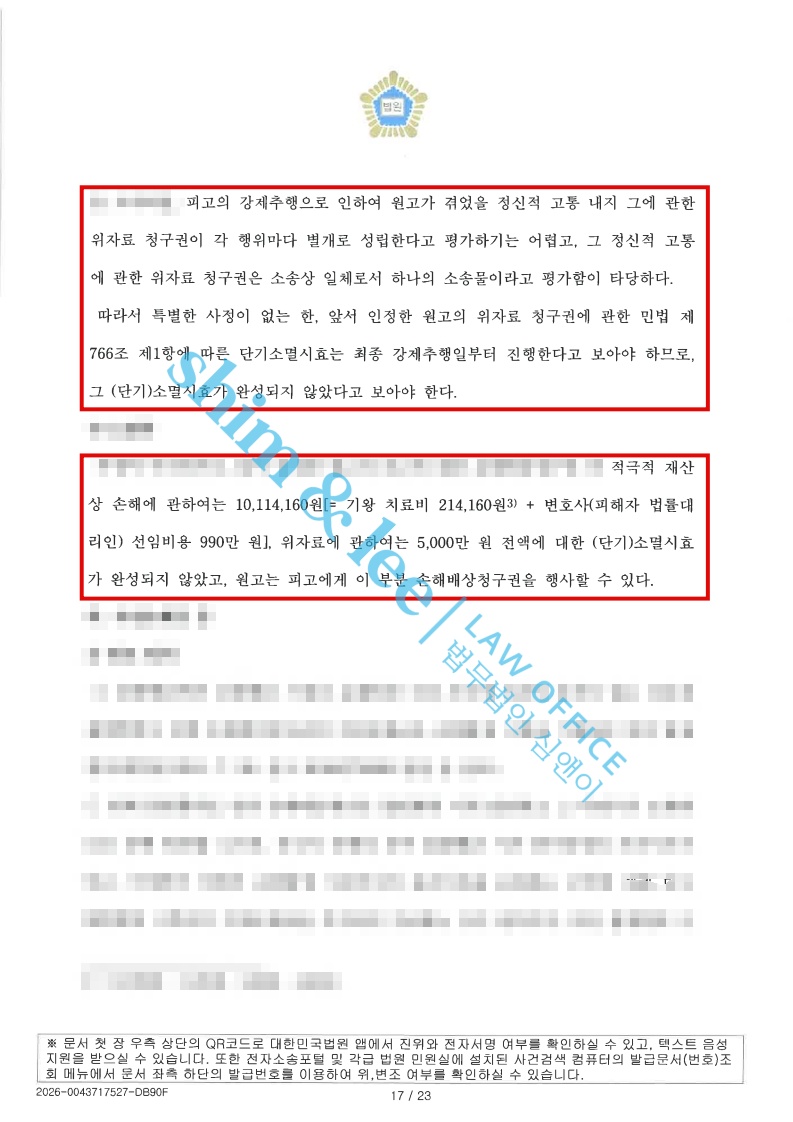 - 또한 소멸시효 문제에 대해서도 단순히 ‘3년이 지났는지’로 판단하지 않고, 심앤이가 주장한 그대로 강제추행이 일정 기간 동안 반복된 구조를 가지므로 전체적으로 하나의 계속된 불법행위로 판단해야 한다고 인정해주었습니다.