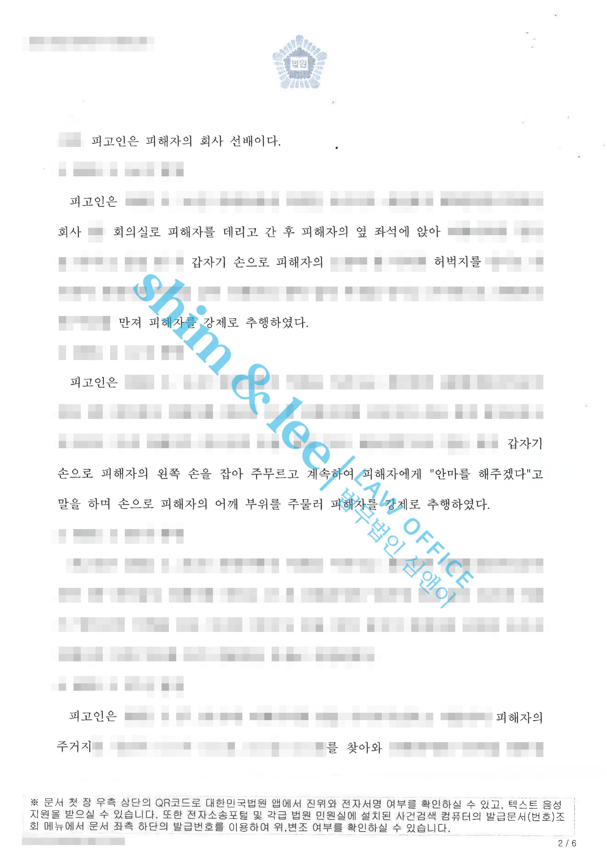 - 회의실에서 가해자는 업무와 관련된 이야기를 하는 척하며 의뢰인에게 가까이 다가왔고, 갑자기 의뢰인의 허벅지에 손을 올려 쓰다듬었습니다. 의뢰인은 예상치 못한 상황에 당황해 곧바로 자리를 피했습니다. 그러나 그날 이후 가해자의 신체 접촉은 점점 잦아지고 그 정도도 점차 심해졌습니다.