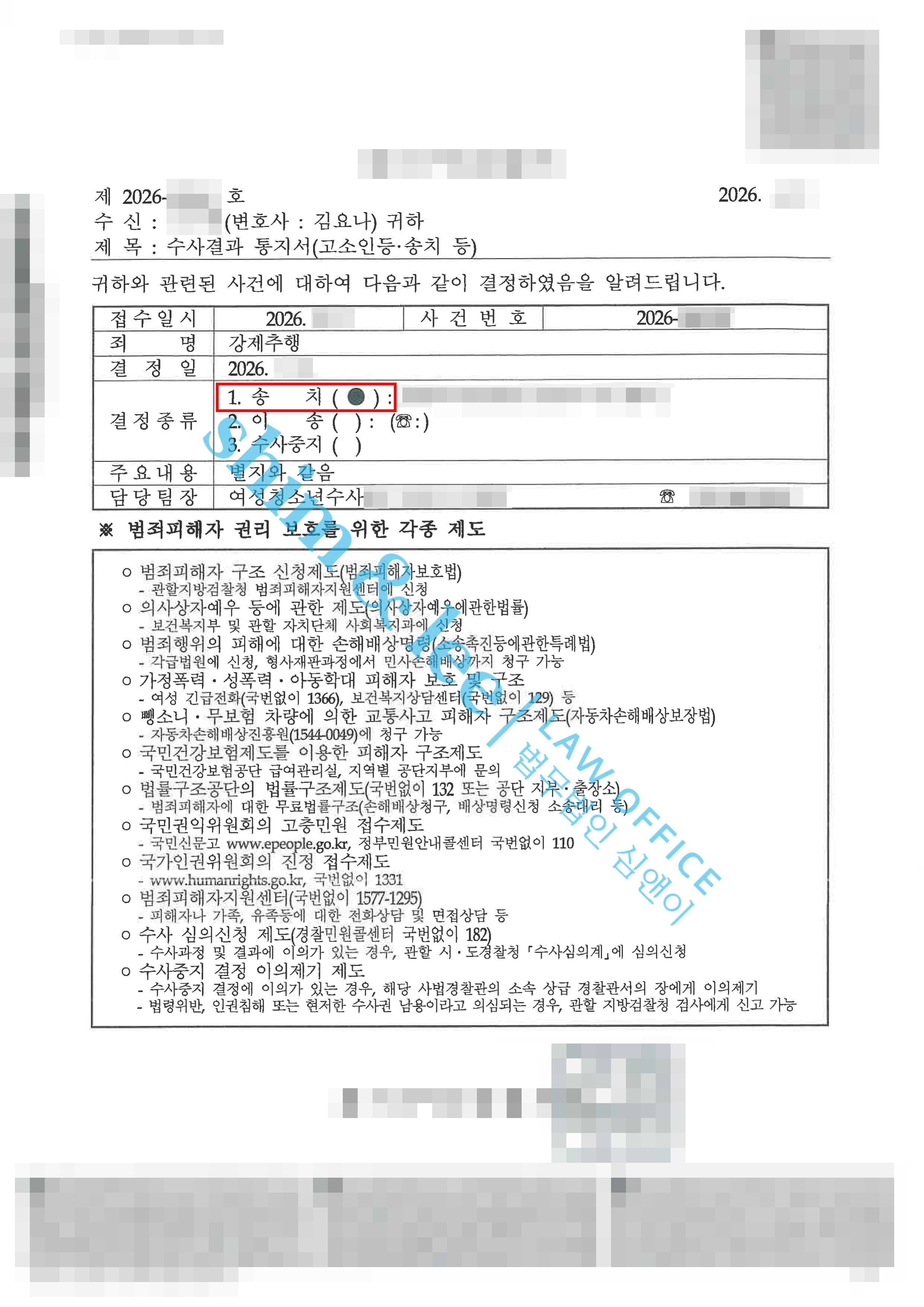 - 심앤이는 피해자의 입장에서 사건 초기 단계부터 진술의 흐름을 정리하고, 객관적인 자료를 바탕으로 정황을 보강하여 수사기관이 사건의 핵심을 정확히 이해할 수 있도록 조력하고 있습니다. 유사한 피해로 고민하고 계신 분들이라면 혼자 고민하기보다는 초기 단계부터 전문가의 도움을 받아 사건을 진행하시기를 권해드립니다.