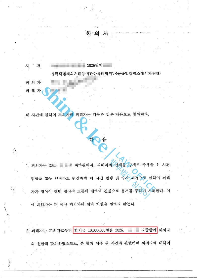 대표 변호사님은 합의서에 비밀유지, 접근•보복금지, 소제기금지 등 의뢰인을 보호할 수 있는 조항을 포함시켜, 합의 이후에도 추가적인 문제가 발생하지 않도록 조력했습니다.